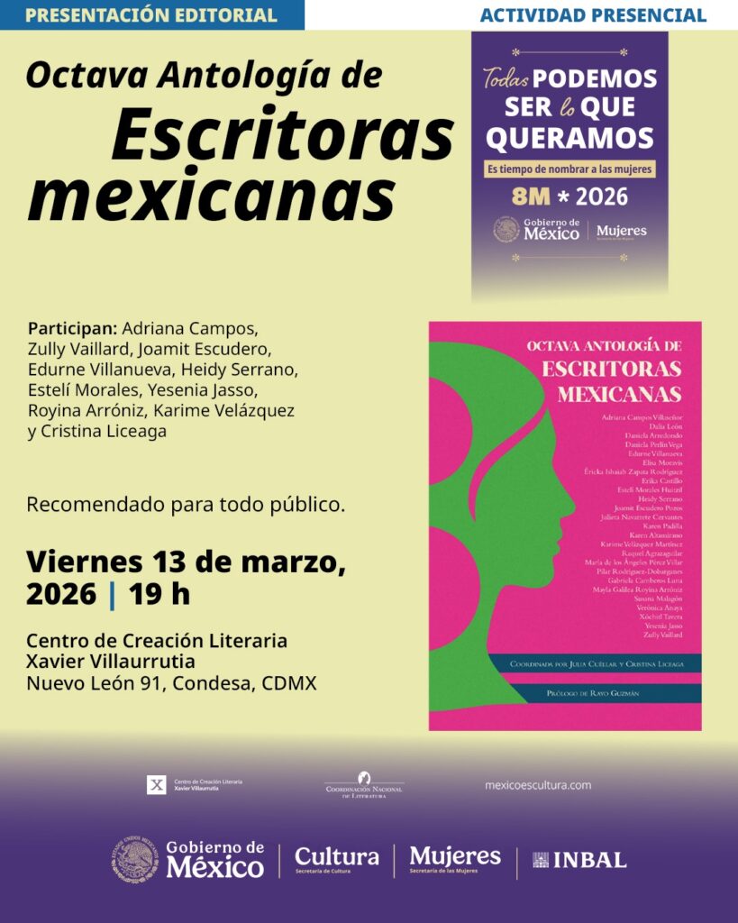 En el marco del Día Internacional de la Mujer, la Secretaría de Cultura del Gobierno de México y el Instituto Nacional de Bellas Artes y Literatura (INBAL), a través de la Coordinación Nacional de Literatura, presentarán la Octava Antología de Escritoras Mexicanas en el Centro de Creación Literaria Xavier Villaurrutia, la cual reúne 26 cuentos que representan un espejo crítico de las problemáticas que atraviesan y definen la experiencia de ser mujer.