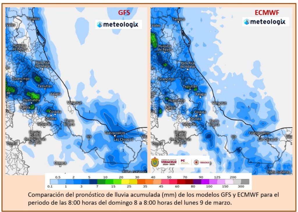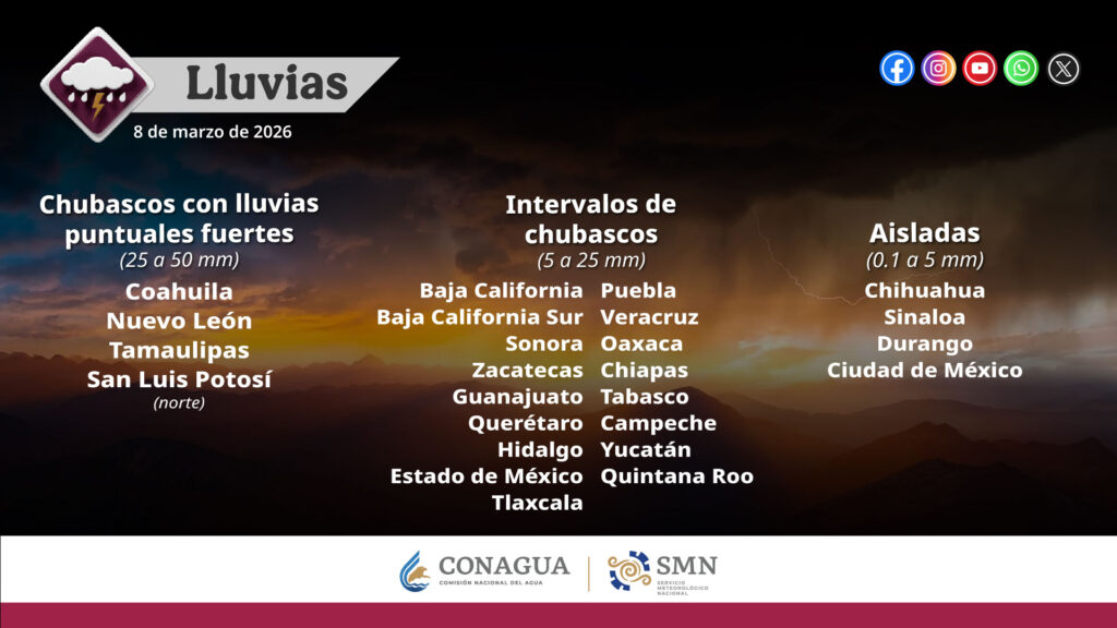 Intervalos de chubascos (de 5 a 25 mm) en Baja California, Baja California Sur, Sonora, Zacatecas, Guanajuato, Querétaro, Hidalgo, Estado de México, Tlaxcala, Puebla, Veracruz, Oaxaca, Chiapas, Tabasco, Campeche, Yucatán y Quintana Roo.