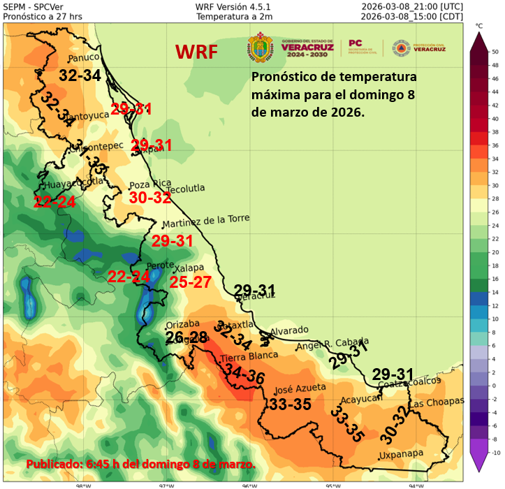 Las temperaturas máximas irán de 40 a 45 °C en Guerrero (noroeste) y Oaxaca (istmo); y las máximas de 35 a 40 °C en Sinaloa (sur), Nayarit, Jalisco, Colima, Michoacán, Tamaulipas, Morelos, Puebla (suroeste), Chiapas, Tabasco, Campeche y Yucatán.