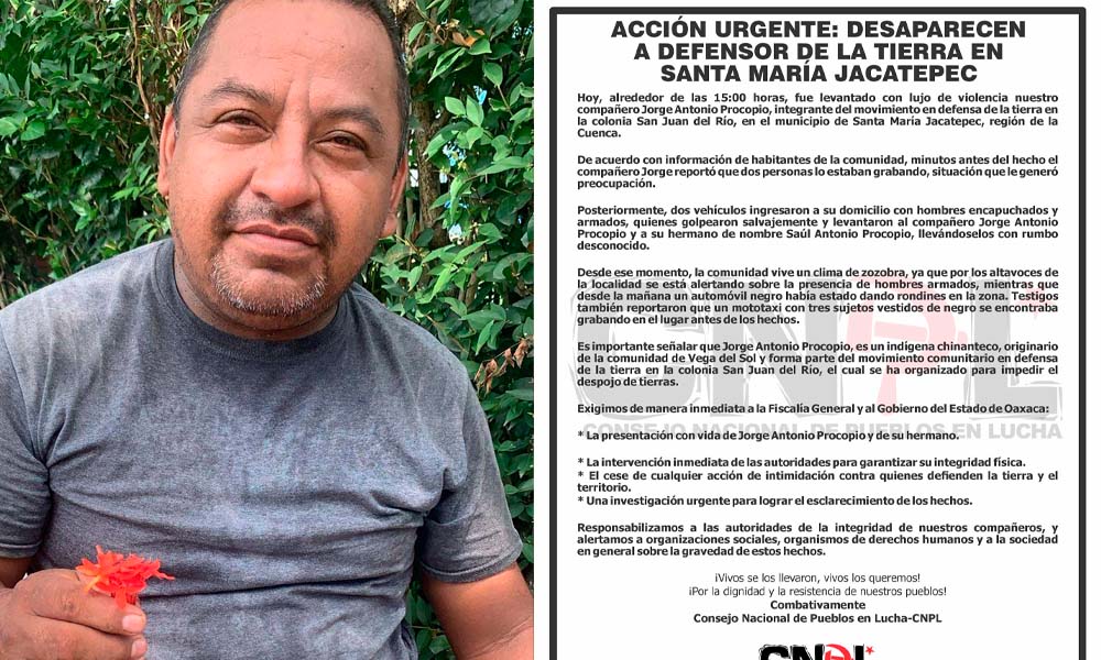El Consejo Nacional de Pueblos en Lucha (CNPL) denunció la presunta desaparición de Jorge Antonio Procopio, integrante del movimiento comunitario en defensa de la tierra en la colonia San Juan del Río, en el municipio de Santa María Jacatepec.De acuerdo con el comunicado difundido por la organización, los hechos ocurrieron alrededor de las 15:00 horas, […]