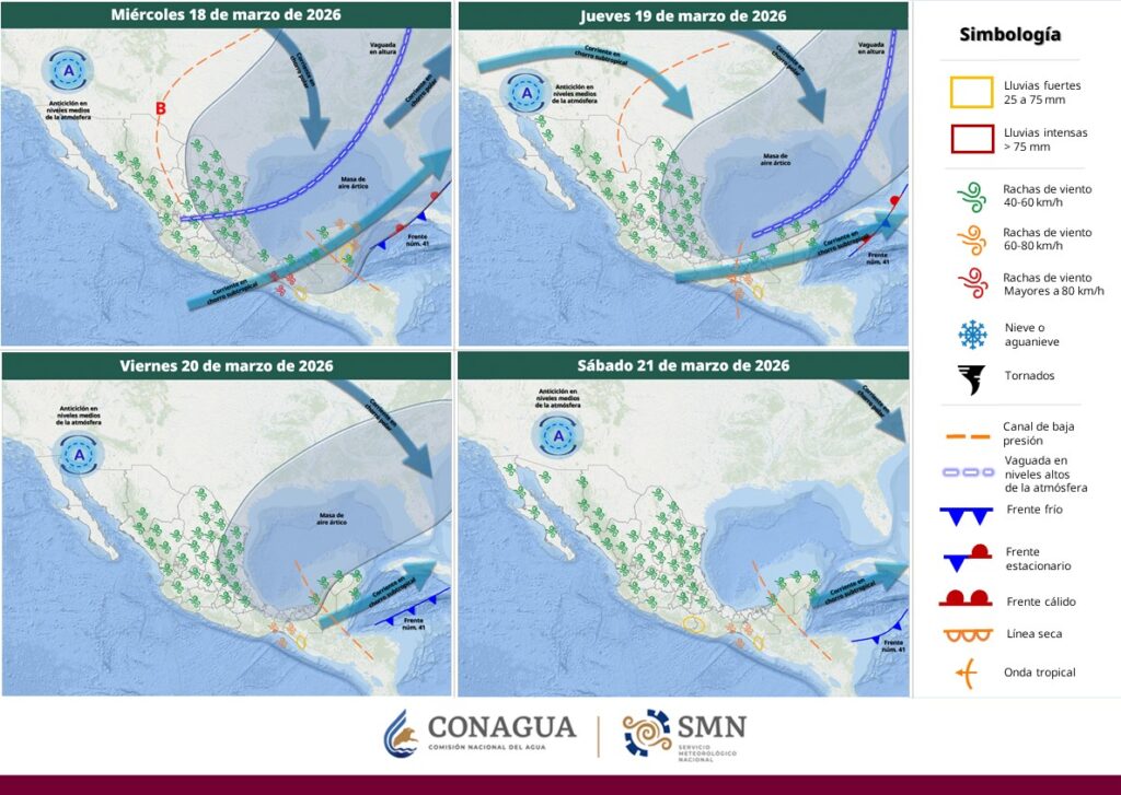 Este día se espera una vaguada polar sobre el golfo de México, la corriente en chorro subtropical y el ingreso de humedad del océano Pacífico y golfo de México.
