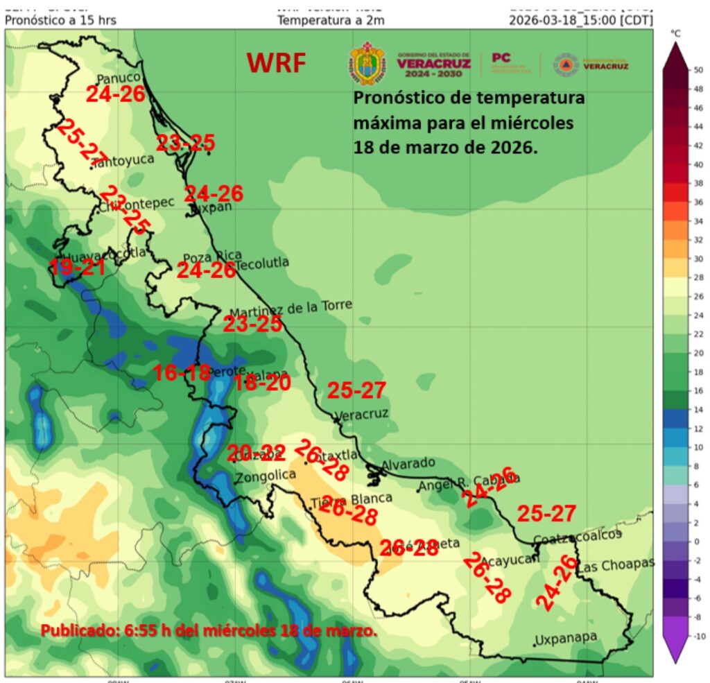 Cielo medio nublado a nublado durante el día, con intervalos de chubascos en Veracruz y Tabasco, y lluvias aisladas en Tamaulipas. Por la mañana ambiente fresco a templado en la región, muy frío en zonas serranas de Veracruz. Durante la tarde, ambiente templado. Viento de componente norte de 10 a 20 km/h con rachas de 30 a 50 km/h en Veracruz (sur) y Tabasco, y viento de componente sur con rachas de 30 a 50 km/h durante la mañana en Tamaulipas. Durante la mañana, oleaje de 1.0 a 2.0 metros de altura en costas de Veracruz (sur) y Tabasco.