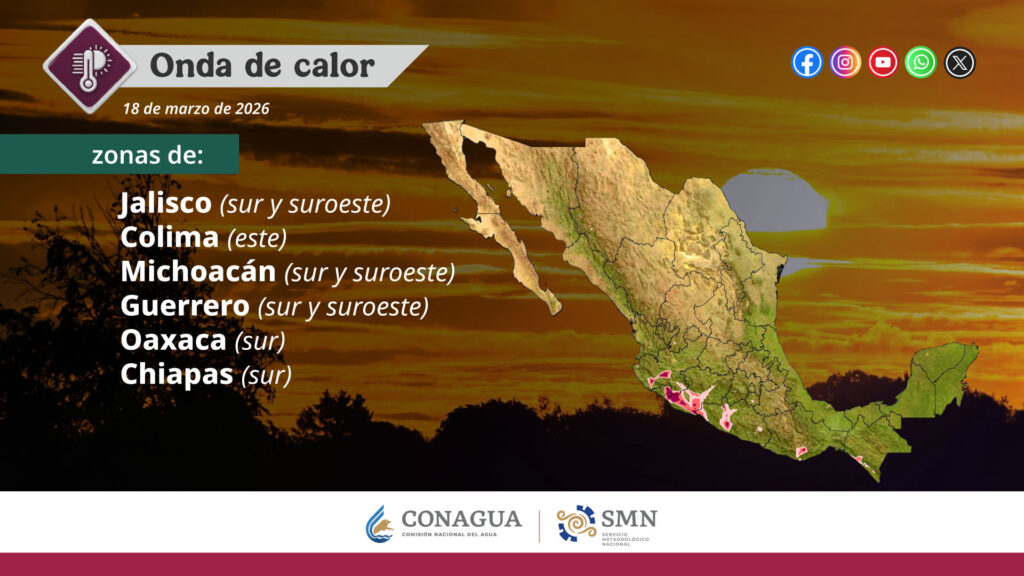 En contraste, agrega, continuará la onda de calor en Jalisco (sur y suroeste), Colima (este), Michoacán (sur y suroeste), Guerrero (sur y suroeste), Oaxaca (sur) y Chiapas (sur).
