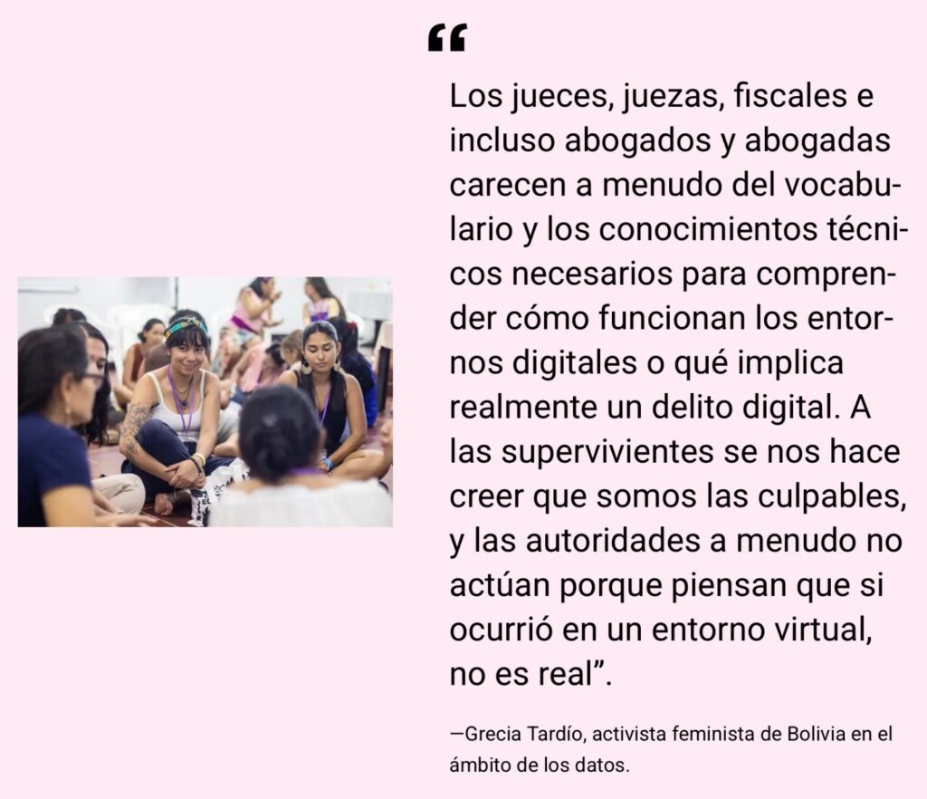 “No tienen leyes (contra la violencia digital) que aborden este problema. Si acudes a un abogado o una abogada de oficio, te dicen que tu caso tardará cinco años en resolverse, cuestionan si vale siquiera la pena iniciarlo”.
