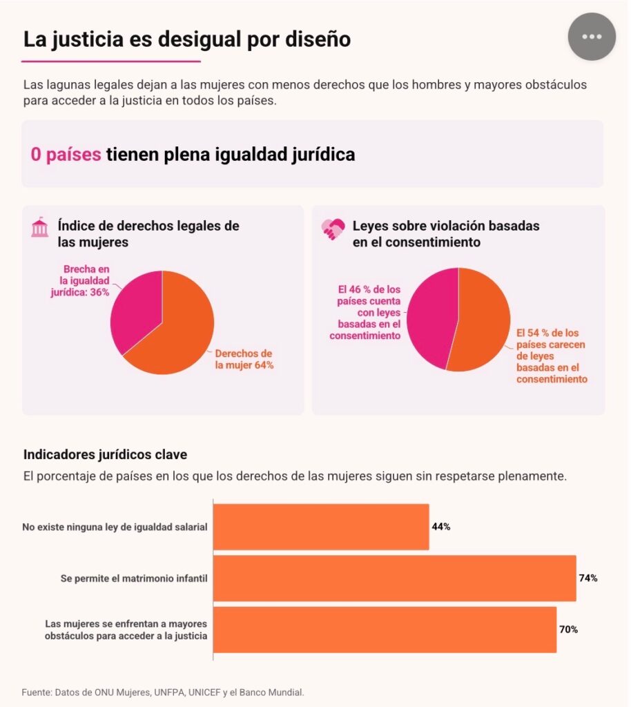 Ningún país ha logrado la plena igualdad jurídica de las mujeres. En términos sencillos, esto significa que en todos los rincones del mundo las leyes siguen tratando a las mujeres y los hombres de manera diferente. Por ley, las mujeres tienen menos derechos que los hombres. Estas lagunas legales deciden quién goza de protección, a quién se cree, quién puede reclamar sus derechos y a qué versión de los hechos se otorga credibilidad. Así es como se consolida la impunidad: más allá de la ley, mediante relatos que restan importancia a la violencia y la vulneración de los derechos, que dudan de las mujeres y disculpan a quienes causan daño.