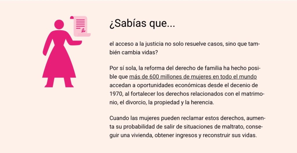 Cuando las mujeres pueden acceder a la justicia, la violencia se detiene y combate antes. Los maltratadores son retenidos y se les exigen responsabilidades por sus actos; los lugares de trabajo se vuelven más seguros y las familias tienen menores probabilidades de quedar atrapadas en ciclos de daño y violencia.