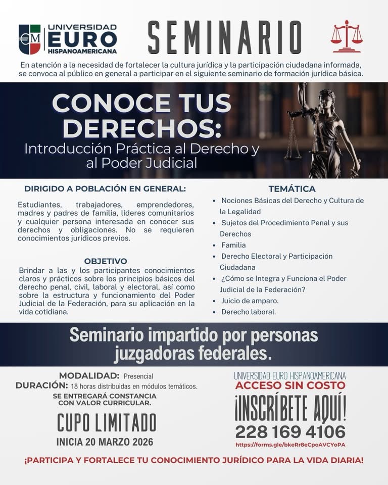 La Universidad Euro Hispanoamericana invita a participar en el Seminario de Formación Jurídica Lo anterior con el objetivo de brindar conocimientos claros y prácticos sobre derecho penal, civil, laboral y electoral, así como sobre la estructura y funcionamiento del Poder Judicial de la Federación. La Universidad Euro Hispanoamericana dio a conocer esta actividad e invitó […]