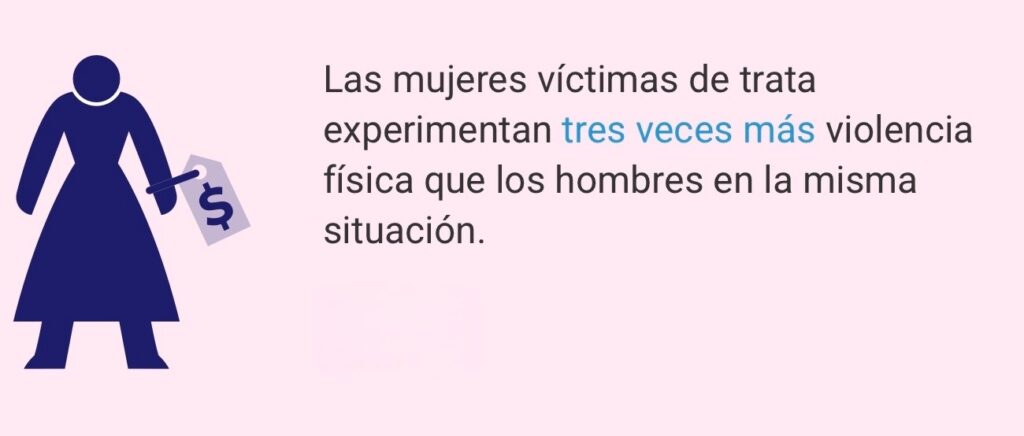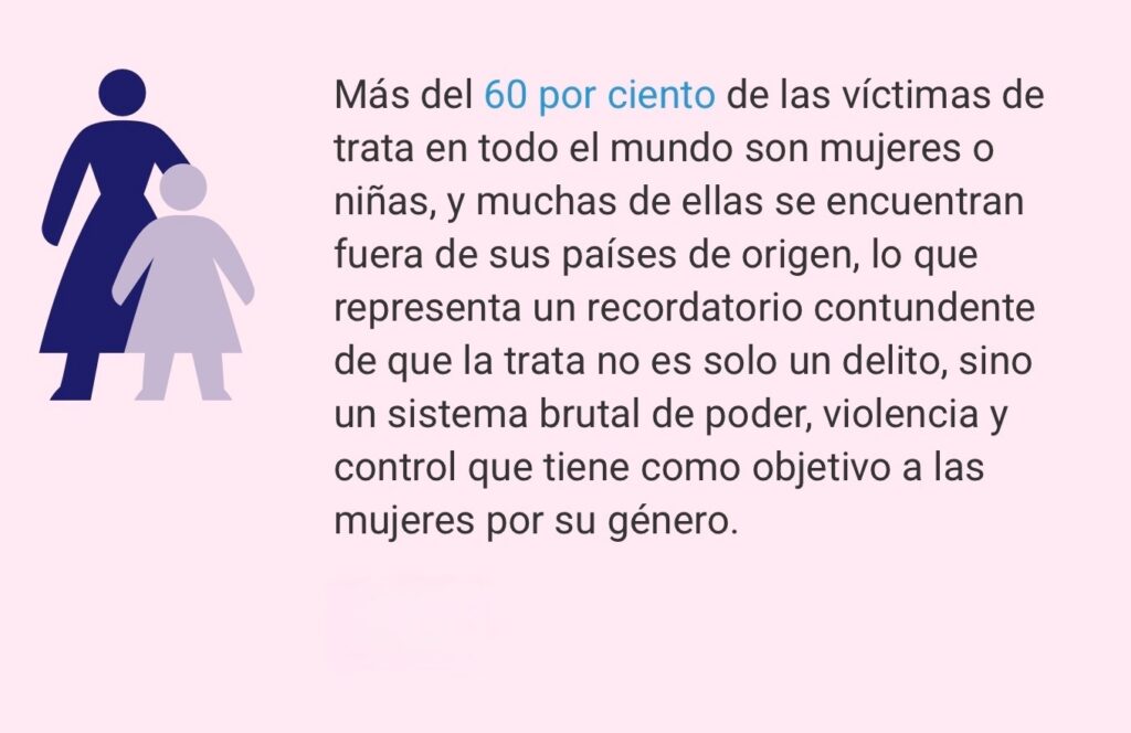 La trata de personas es una de las violaciones más horrendas a los derechos humanos. Debido a las desigualdades de género e impulsados por el lucro, los autores de este delito consideran el trabajo y los cuerpos de las mujeres como mercancías que pueden ser compradas, vendidas, controladas y violadas, y las mujeres son tres veces más propensas a ser víctimas de trata para trabajo forzado que los hombres.