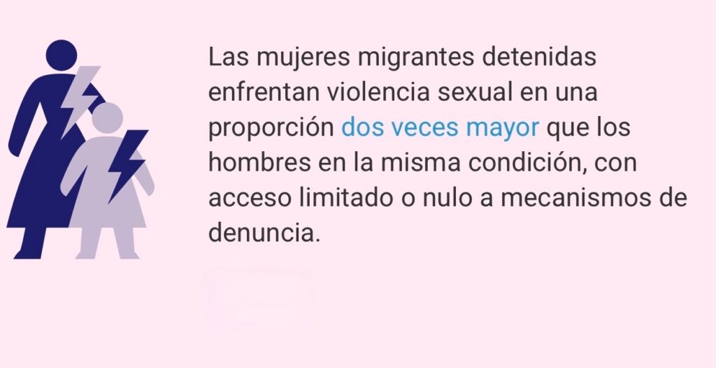 Para las mujeres sin condición migratoria regular, el sistema en sí puede aumentar su exposición al peligro y la violencia. Los centros de detención y deportación suelen ser lugares inseguros y degradantes. Muchas mujeres denuncian haber sido víctimas de abuso sexual, acceso deficiente o nulo a la atención de la salud sexual y reproductiva, y falta de privacidad en las áreas de saneamiento y duchas.