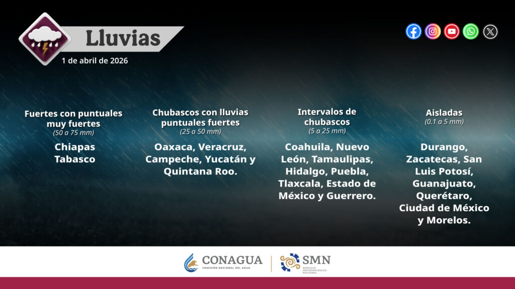 Asimismo, lluvias puntuales muy fuertes en Chiapas y Tabasco.