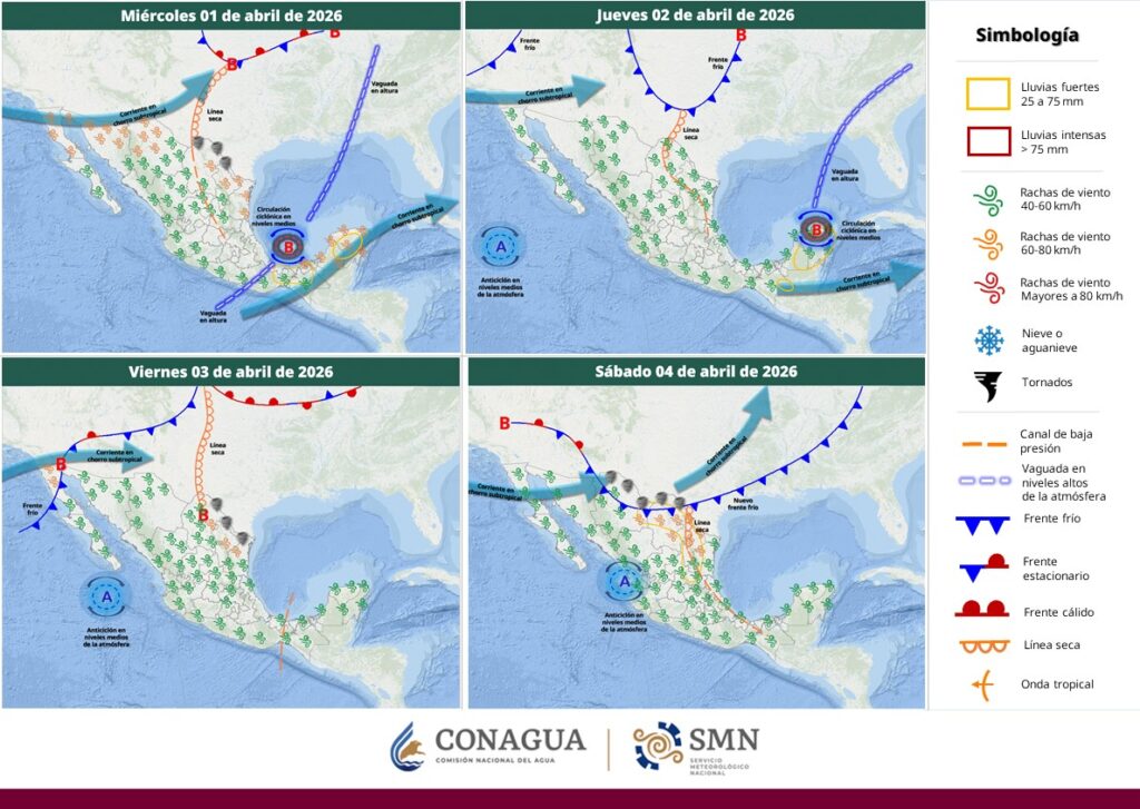 Viento de 30 a 40 km/h con rachas de 50 a 70 km/h en Baja California, Tabasco, Campeche, Yucatán y Quintana Roo.
