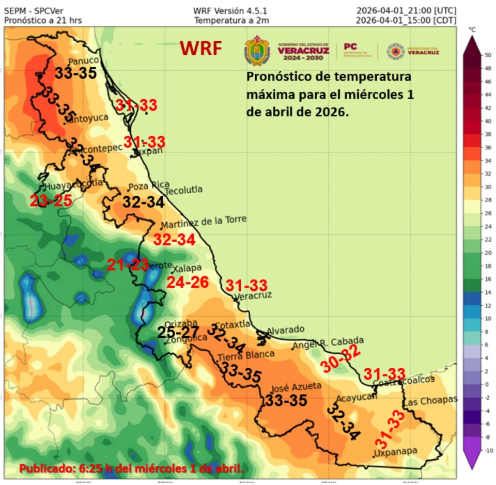 Las máximas de 30 a 35 °C en Baja California Sur (sur), Sonora (sur), Chihuahua, Zacatecas, Querétaro (norte), Veracruz, Tabasco, Campeche, Yucatán y Quintana Roo.