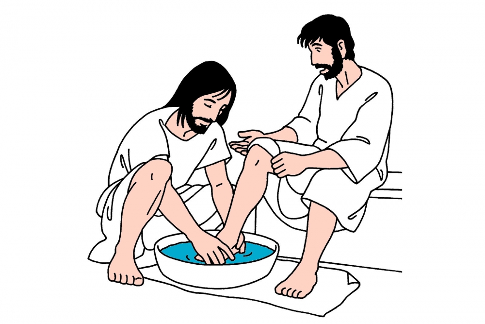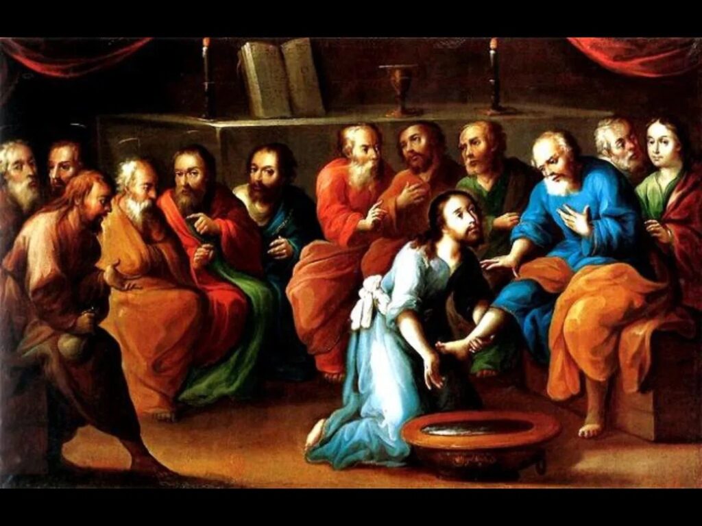 El lavatorio de los pies, realizado por Jesús a sus discípulos. Es considerado un acto de amor al prójimo, servicio y humildad.