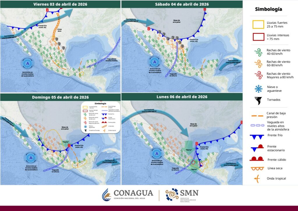 Informa que el Servicio Meteorológico Nacional monitorea los efectos de un nuevo frente frío (núm. 43) y una línea seca sobre el norte de México.
