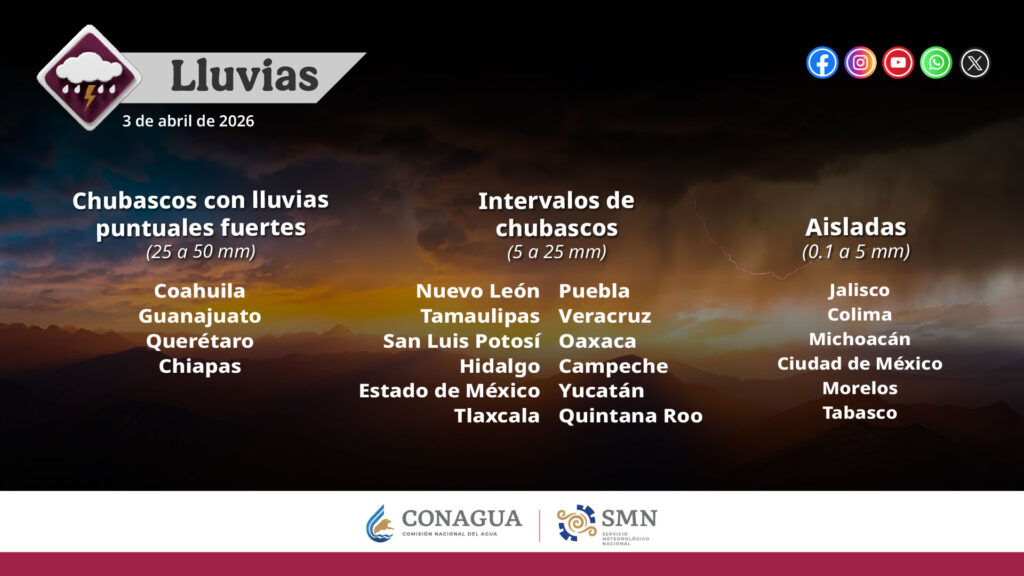 Dichos sistemas, informa la CONAGUA, originarán chubascos y lluvias fuertes acompañadas con descargas eléctricas y probables granizadas.