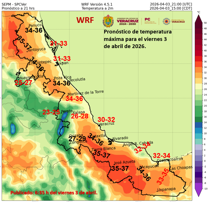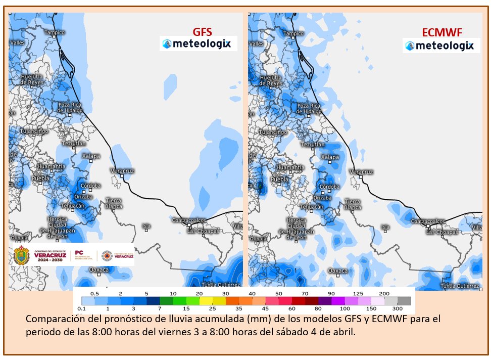 Cielo medio nublado a nublado durante el día, con intervalos de chubascos en Tamaulipas y Veracruz, así como lluvias aisladas en Tabasco; mismas que se acompañarán con descargas eléctricas y posible caída de granizo. Por la mañana ambiente fresco a templado y frío en zonas serranas de Veracruz. Durante la tarde, ambiente cálido a caluroso en la región, y muy caluroso en el oeste de Tamaulipas. Viento de componente sur de 40 a 50 km/h con rachas de 60 a 80 km/h y posible formación de torbellinos o tornados en Tamaulipas, rachas de viento de 30 a 50 km/h en Tabasco, y de componente sur en Veracruz. Oleaje de 1.5 a 2.5 metros de altura en las costas de Tamaulipas.