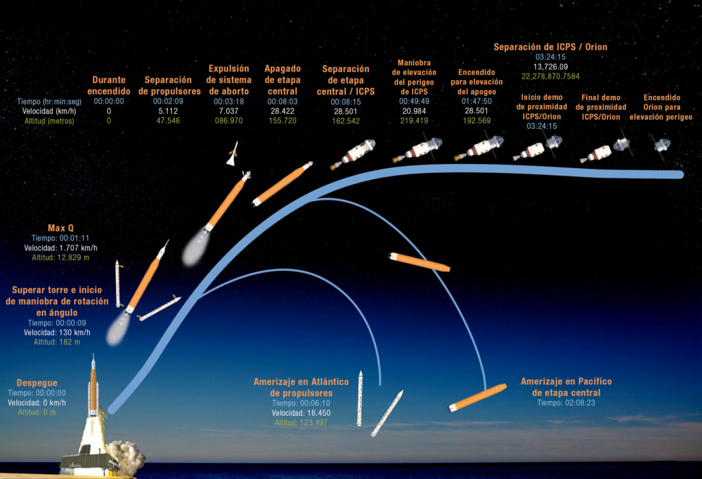 Lanzamiento: El cohete SLS impulsará la nave Orion y su tripulación para alejarlos de la Tierra usando una fuerza de propulsión de más de cuatro millones de kilogramos (8.8 millones de libras).