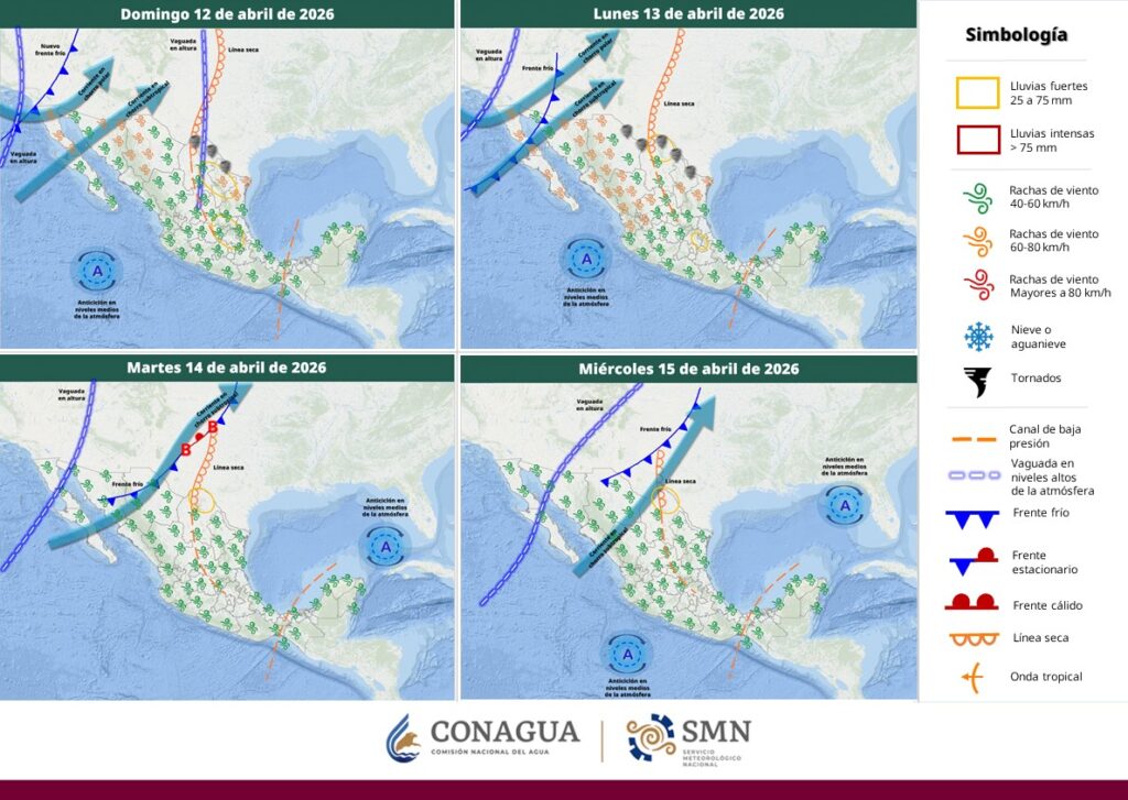 Pronostica viento de 40 a 50 km/h con rachas de 60 a 80 km/h en Baja California; y posible formación de torbellinos en Coahuila (norte), Nuevo León (norte) y Tamaulipas (noroeste y norte).