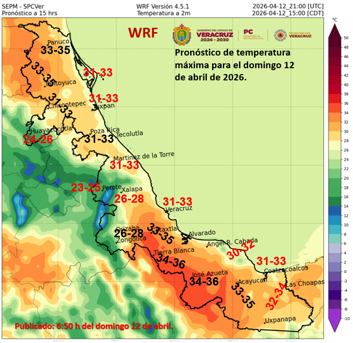 Las máximas de 30 a 35 °C en Zacatecas, San Luis Potosí, Querétaro (norte), Hidalgo (norte), Estado de México (suroeste), Veracruz, Tabasco y Quintana Roo.