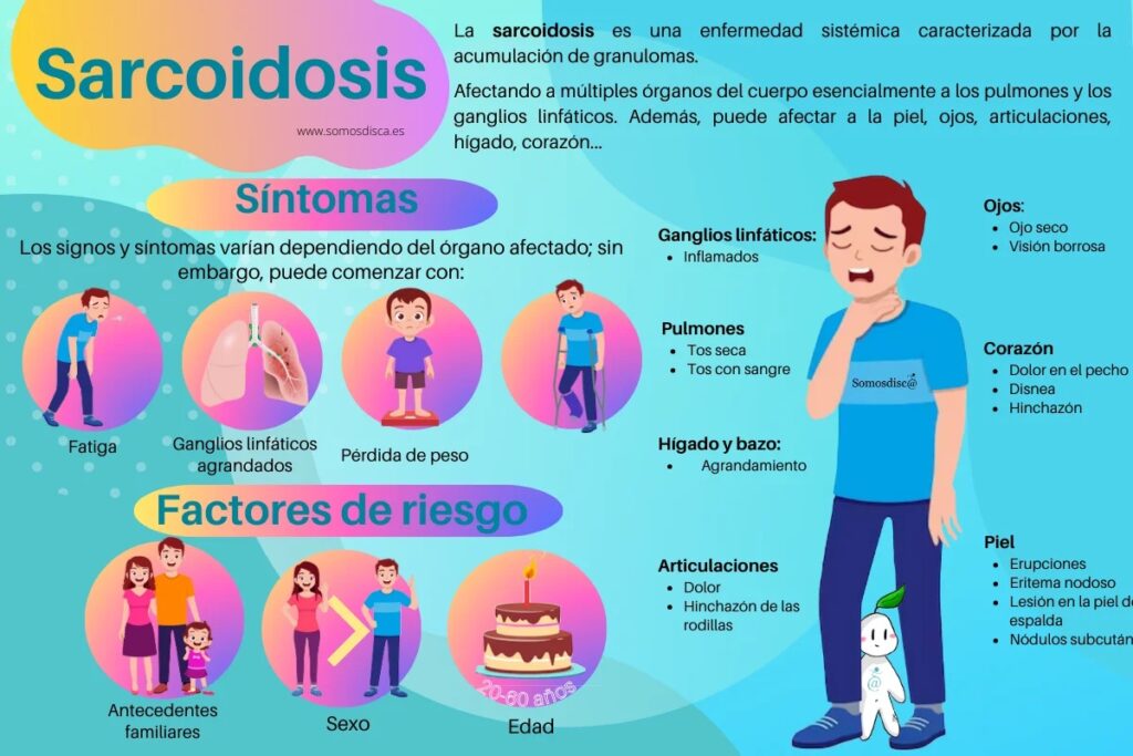 La sarcoidosis es una enfermedad inflamatoria crónica que puede afectar a múltiples órganos del cuerpo, pero más comúnmente afecta a los pulmones y los ganglios linfáticos.