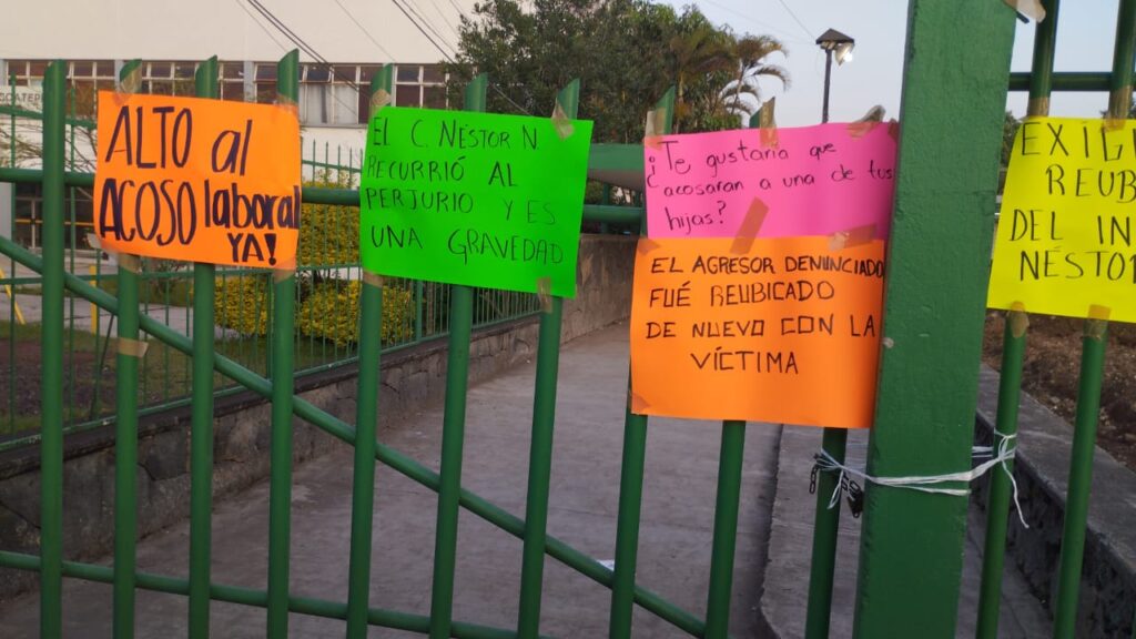 Las y los docentes inconformes colocaron en el acceso principal de este plantel cartulinas en la que denuncian la decisión de las autoridades educativas, exponiendo que “el agresor denunciado fue reubicado de nuevo con su víctima”.