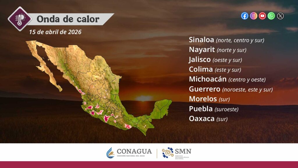 Apunta que se mantendrá la onda de calor en Sinaloa (norte, centro y sur), Nayarit (norte y sur), Jalisco (oeste y sur) y Colima (este y sur).