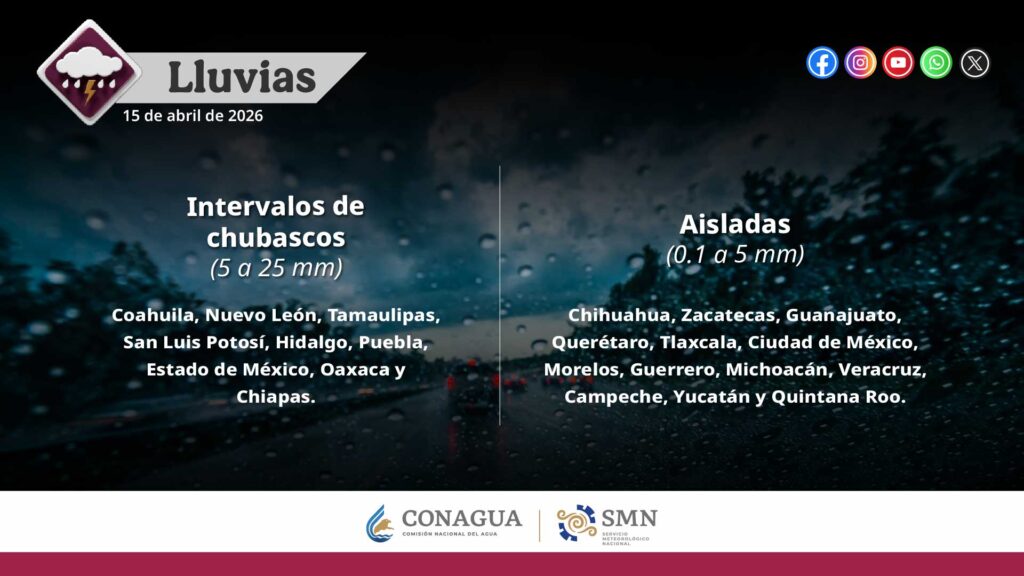Lluvias aisladas (de 0.1 a 5 mm) en Chihuahua, Zacatecas, Guanajuato, Querétaro, Tlaxcala, CdMx, Morelos, Guerrero, Michoacán, Veracruz, Campeche, Yucatán y Quintana Roo.