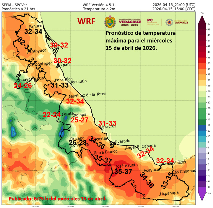Las máximas de 30 a 35 °C en Aguascalientes, San Luis Potosí, Guanajuato, Querétaro, Hidalgo, Estado de México (suroeste), Veracruz, Tabasco y Quintana Roo.