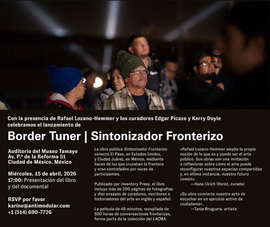 La Secretaría de Cultura del Gobierno de México y el Instituto Nacional de Bellas Artes y Literatura (INBAL), a través del Museo Tamayo, invitan a la presentación del libro y de la película de archivo que registran la obra de arte público Sintonizador Fronterizo | Border Tuner, del artista Rafael Lozano-Hemmer.