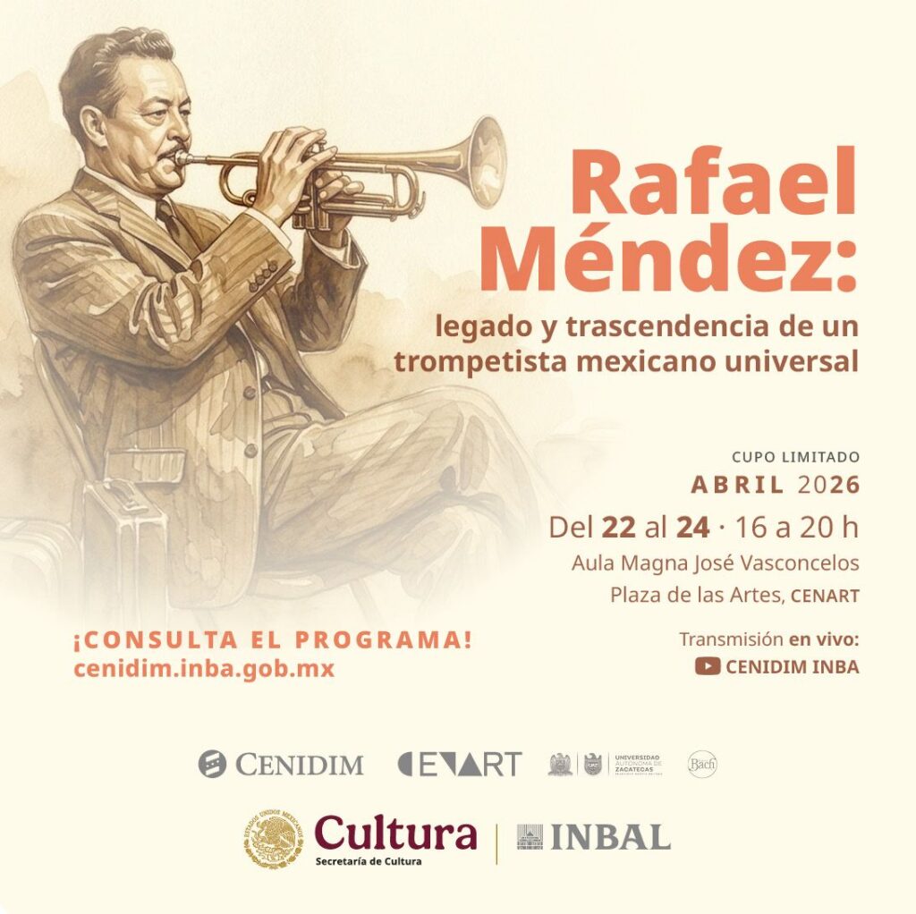 El Centro Nacional de Investigación, Documentación e Información Musical “Carlos Chávez” (CENIDIM), de la Subdirección General de Educación e Investigación Artísticas (SGEIA) del Instituto Nacional de Bellas Artes y Literatura (INBAL), en colaboración con la Universidad Autónoma de Zacatecas (UAZ), invita a las jornadas Rafael Méndez: legado y trascendencia de un trompetista mexicano universal, que se llevarán a cabo del 22 al 24 de abril en el Centro Nacional de las Artes.