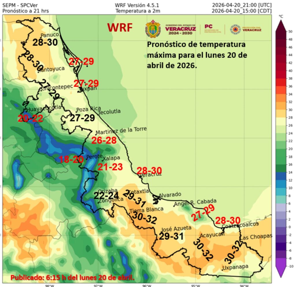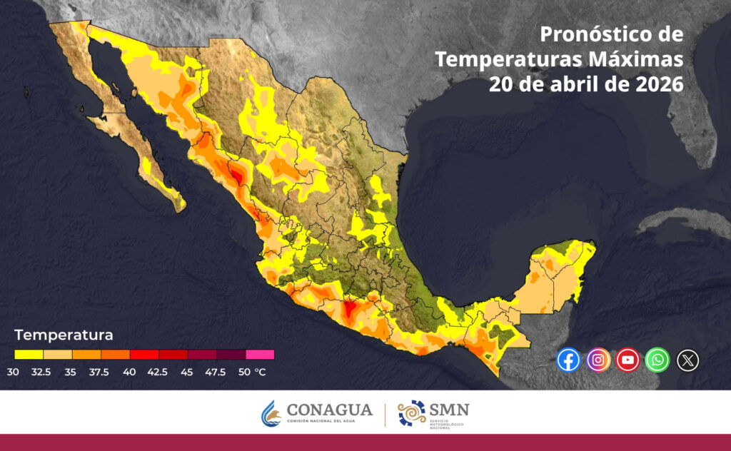 Las máximas de 35 a 40 °C en Estado de México (suroeste), Morelos (sur), Puebla (suroeste), Oaxaca, Campeche (norte), Yucatán (sur) y Quintana Roo.