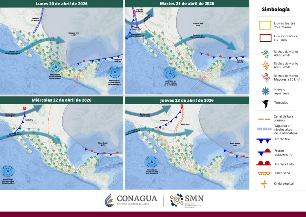 Asimismo, informa la CONAGUA, en interacción con la entrada de aire húmedo del mar Caribe, lo que ocasionará lluvias puntuales fuertes en Veracruz, Oaxaca, Chiapas y Tabasco.