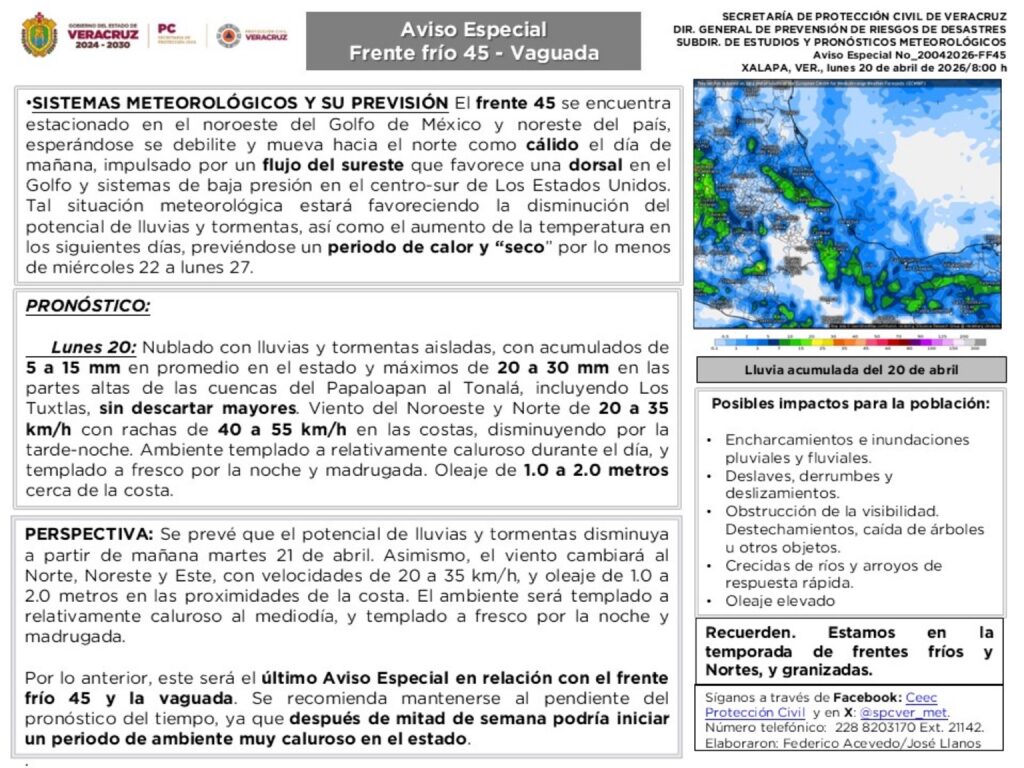 Informa que el Servicio Meteorológico Nacional monitorea los efectos del frente número 45, sobre el golfo de México.