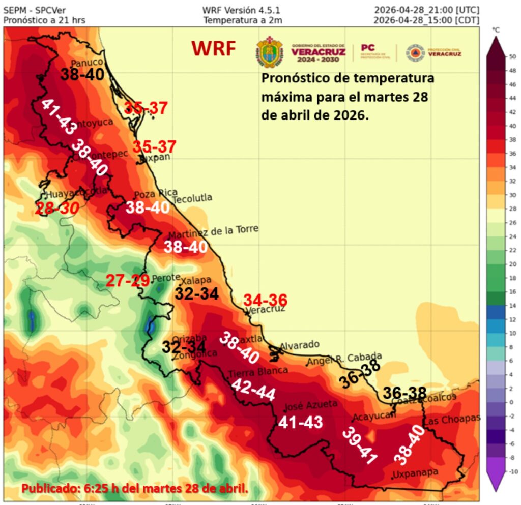 Las máximas irán de 40 a 45 °C en Tamaulipas (centro, oeste y noroeste), Veracruz (norte y centro), Campeche (norte) y Yucatán (noroeste).