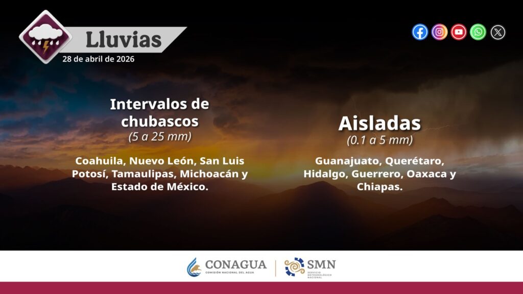 Pronostica intervalos de chubascos (de 5 a 25 mm) en Coahuila, Nuevo León, San Luis Potosí, Tamaulipas, Michoacán y Estado de México.